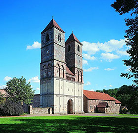 Kloster Veßra, Foto: © Thüringer Schlösser und GärtenNur wenige Kilometer entfernt liegt die Kreisstadt Hildburghausen, eine ehemalige Residenzstadt, die sich rühmen kann, ein Theater weiter zu bespielen, das bereits 1721 errichtet wurde. 2008 wurde es saniert. Noch etwas weiter Richtung Meiningen fahren wir, wo an der Einmündung der Schleuse in die Werra das ehemalige Prämonstratenserkloster Veßra liegt. Die noch in Teilen erhaltene romanische Klosterkirche, das Ensemble der Kloster- und Domänengebäude und das angegliederte Freilichtmuseum mit gemütlichem Café sind etwas ganz Besonderes, ein echter Höhepunkt im „Henneberger Land“ in Südthüringen, wo wir uns jetzt befinden.